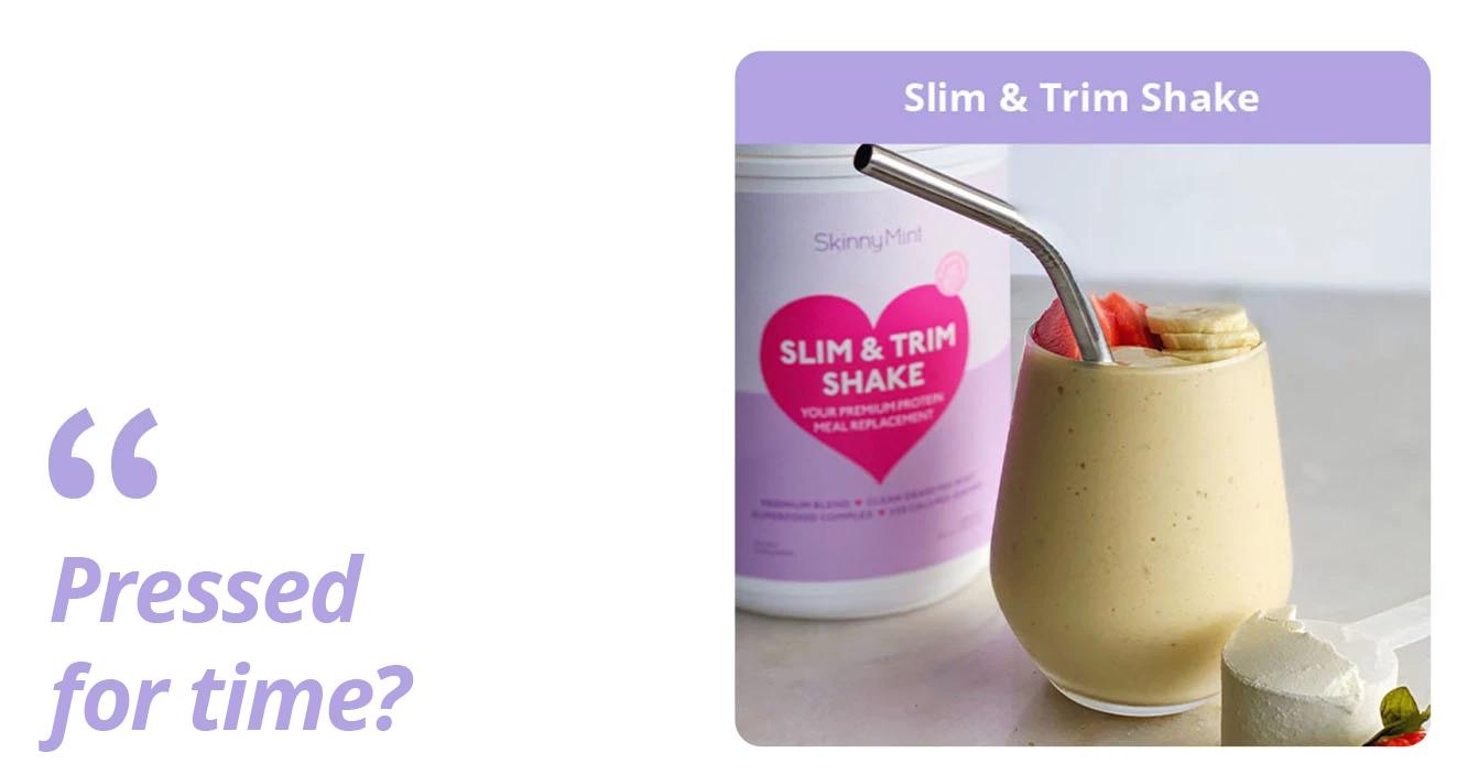 If you have a busy lifestyle, you'll be glad some of the meals have short prep times. For even greater convenience, replace 2 meals a day with SkinnyMint's Slim & Trim Shake. Get a nutrition boost (we're talking 11 vitamins and minerals) at only 220 cals per serving. Shakes up in just minutes and did we say... it tastes like cupcakes?